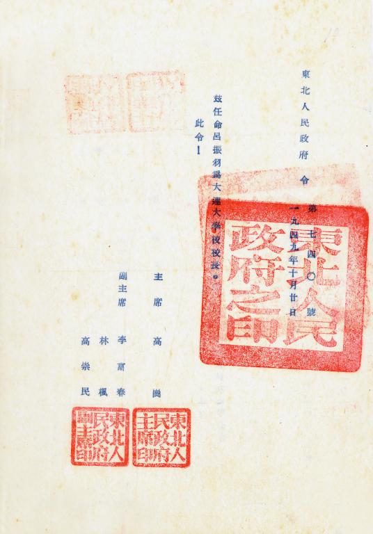 东北人民政府任命吕振羽为大连大学校长的文件