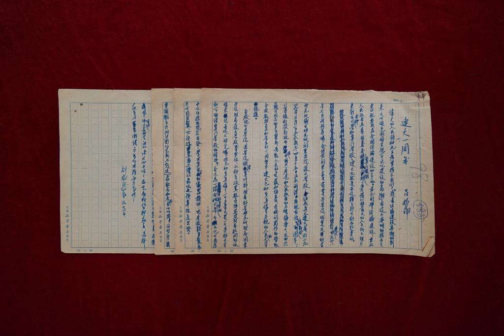 访谈之余,吕振羽纪念室的工作人员还带我们参观了平日并未对外开放的吕振羽藏书室,正中间陈列着吕老生前使用过的桌椅和台灯,其他空间几乎都被吕老琳琅满目的藏书占满。吕坚先生还专门从家中找来他珍藏着的“宝贝”,包括吕老在大连大学期间的的工作日记、讲话稿、书面报告等等,并将最为珍贵的吕振羽校长9页的“连大一周年”文章手稿捐赠给了档案馆,为吕振羽人物档案增添了最为浓重的一笔。吕坚先生表示,待吕振羽校长史料全部整理出版后,会将其大连大学时期的手稿原件悉数捐赠给档案馆。